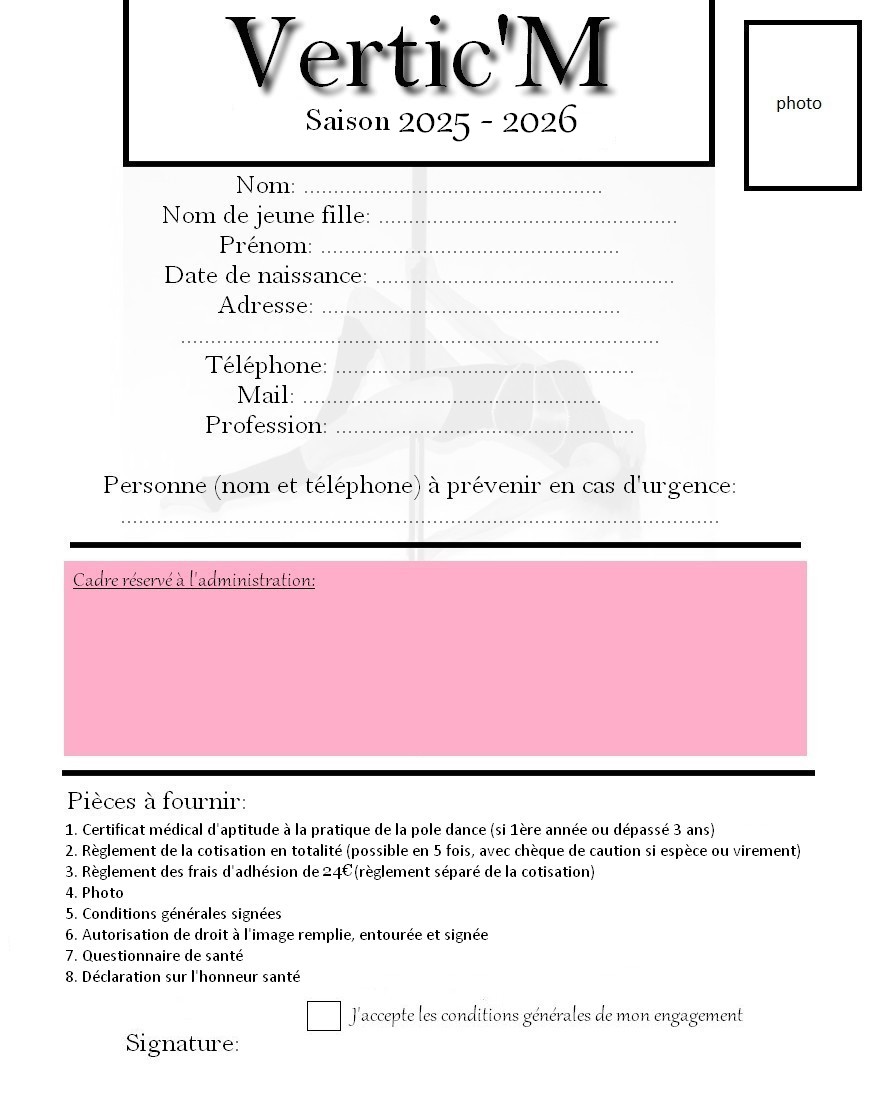 Un dossier d'inscription est demandé pour toutes formules d'abonnement choisie (hors cours à l'unité, cours d'initiations, stages ...)